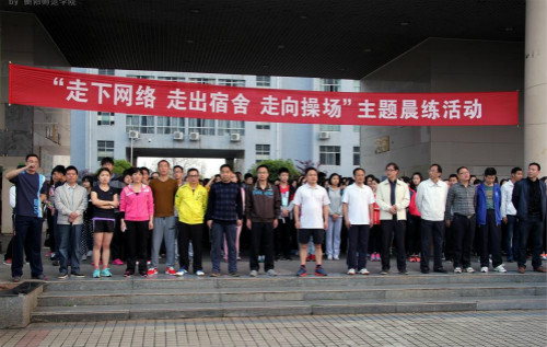 3月31日清晨,校长皮修平,副校长聂东明等学院领导带领近3000名学生代表在国旗广场开展了“走下网络,走出宿舍,走向操场”晨练活动。
