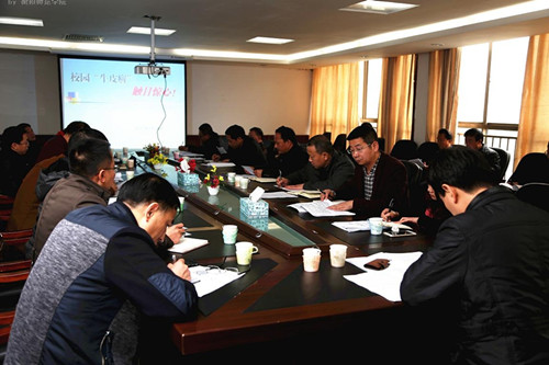3月13日下午,学校召开校园“牛皮癣”专项整治协调会,讨论研究整治方案。校长皮修平,副校长张登玉、廖北文、聂东明出席会议,专项整治领导小组成员参加。会议由副校长聂东明主持。