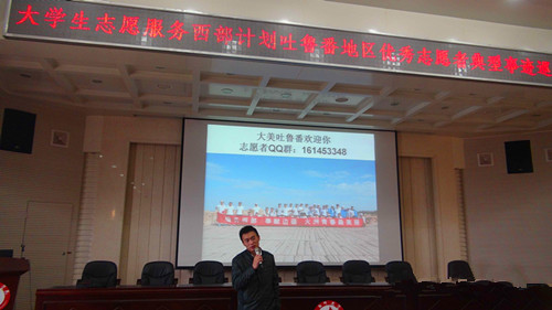 演讲会由一段大学生志愿服务西部的视频《奋斗的青春最美丽》拉开序幕,徐书记上台为大家简单介绍了一下吐鲁番的人文景观及自然景观,为大家详细介绍了吐鲁番地区为西部计划志愿者提供的各种优惠条件:服务两年期满且考核合格,一定期限内可以报考公务员、事业编的定向职位;服务两年期满且考核合格三年内考研加10分;服务期计算工龄。他说,目前国家正提出“丝绸之路经济带”的建设,在西部急需要一批有理想、有抱负、有能力的青年。
