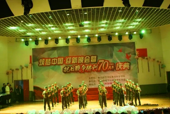 大一新生表演的开场舞《咱当兵的人》为晚会拉开序幕,他们英姿飒爽,动作干脆利落,整齐有力,既展现的新生的意气风发还透着军人的坚韧挺拔。《鬼子进村》、《英雄儿女》两个小品讲述了抗战时期中国人民和日军斗智斗勇的故事,全场笑声不断。扬琴与古筝合奏的《山丹丹花开红艳艳》和情景拉丁舞表演更给同学们带来了艺术的享受。默剧表演《等着我吧》演绎经典,将远在战场思念亲人的情感展现的淋漓尽致。《南山南·梦一场》民谣的现场演唱引发观众尖叫连连,男神女神联手惊喜不断。创意打击乐《cups》借用杯子敲出乐声,配合滑板和街舞成了整场晚会最有新意的节目。