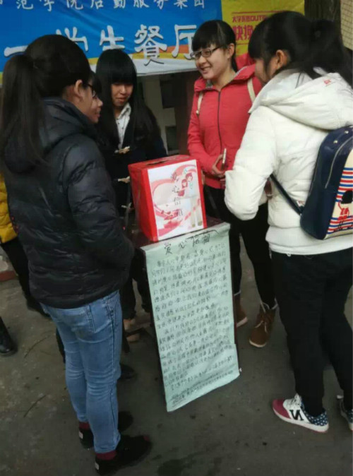 本次活动面向我院所有师生收集爱心信件,将收到的信件进行分类和计数,按不同区以及不同宿舍楼进行分配并委托值班人员一一派送。尽管活动期间气温骤降,北风呼啸,值班人员仍旧满怀热情地为前来咨询的同学解疑释惑。经管系学生更是热情高涨,在寒风中将自己的满怀心意寄托于纸上,并将信纸精心地折成心形或花形,以古朴而温暖的方式向朋友道出自己心底的感动与祝福。