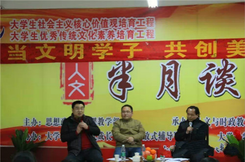 12月26日晚,人文系在理综楼南举办了以“文明的力量”为主题的第七期人文半月谈活动。活动邀请了人文系辅导员王鲁南老师和谢华老师担任对话嘉宾,人文系党总支书记蒋杰应邀参加了本次活动。