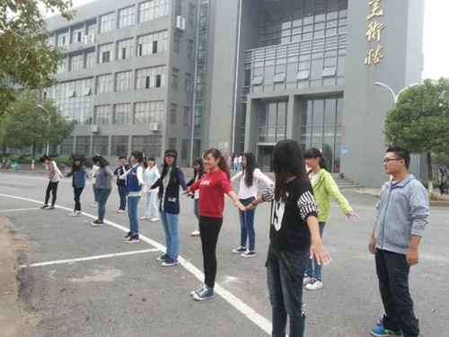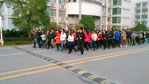 “嗒嗒砰砰砰……”。操场上,是谁弹奏出这么美妙的音乐?哦,原来是体育运动中必备活动——跳长绳。两边的同学用力挥动手臂,摇起绳子,“嗡嗡”直响,如同一道银弧。银弧之中,同学们像松鼠上蹿下跳,像燕子往返疾飞……记数的同学大声喊着:“五十六、五十七……”欢声笑语充斥着整个操场。14级绘水班班长刘溢帆也兴奋地跑到活动场地,向跳绳达人讨教跳大绳的技巧。另一边,有学妹开心地说道:“跳大绳,勾起我许多的童年回忆呢!”