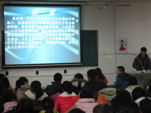 讲座开始,化材系辅导员唐升唐老师给大家讲解了预防宿舍火灾“五个不”和逃生自救“小贴士”,强调了预防火灾应该从我做起,要从意识上防范未然,并希望同学们把本次活动内容尽快传达给其他同学。接下来,生活部副部长瞿彬借助PPT和视频,结合化材系同学的实际,从消防安全教育的必要性、火灾发生的原因、冬季宿舍用电安全等方面进行了全面分析,让在场同学对消防安全知识有了更深入的了解。最后,活动在轻松有趣的消防安全知识“有奖问答”环节中圆满结束。