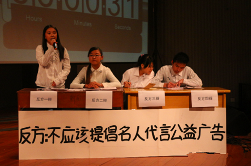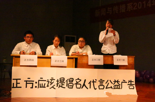 本次辩论赛共分为开篇立论,功辩,功辩小结,自由辩论,高端对话,总结陈词和评委团代表评分点评等七大阶段。经过初赛五场辩论角逐出的八位辩手分为正反两方以“应不应该提倡名人代言公益广告”为辩题展开论述。