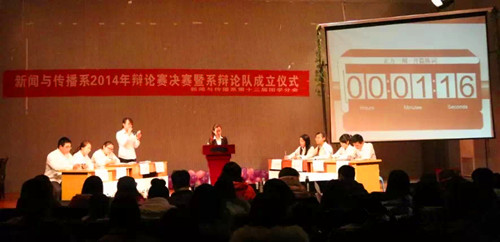 12月11日晚,新闻与传播系在新闻演播厅举办新闻系2014年大学生辩论赛决赛暨新闻系辩论队成立仪式。新闻系张良君、冯林、熊雅静老师担任评委。