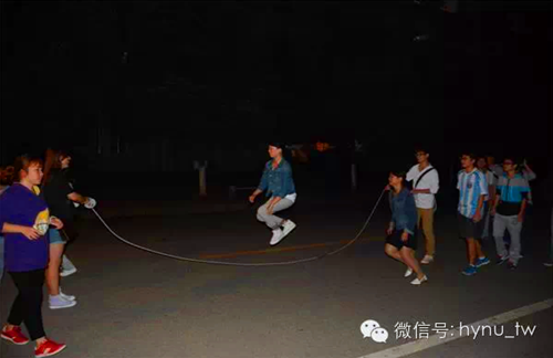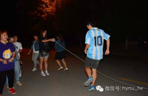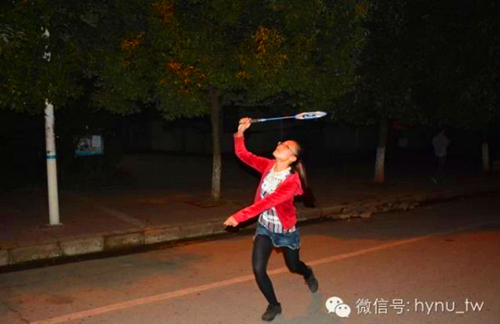 10月21至22日晚间,在学校宽广的马路上突然多了一群集体散慢跑的学生。这群学生从红旗广场出发,经音乐楼、理综楼、美术楼最终女生七栋宿舍楼旁的沙地集合。在那里,集合起来的同学们拿出早已准备好的运动器械,羽毛球、毽子、跳绳等开始了晚间运动。这是新闻系最新推出的晚练的活动场面。路灯下,同学们活跃的身影瞬间成为了师院的“焦点”。