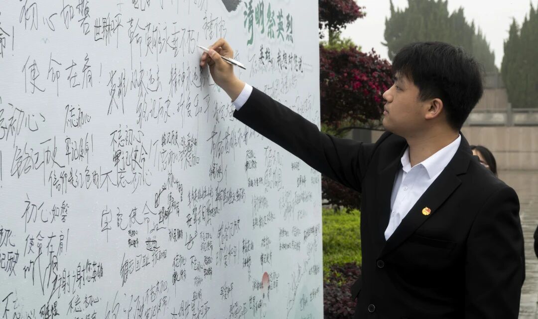 仪式最后,全体师生依次向烈士纪念碑敬献鲜花,行三鞠躬礼。献花完毕,全体师生集体瞻仰烈士纪念碑,在巍峨碑身前感悟英烈精神的磅礴力量。随后,师生们手持清洁工具,认真清扫陵园步道、擦拭碑石尘埃,以实际行动守护英烈安息之地,表达对革命先烈的崇高敬意。全体师生还在“2026年我想对英雄说”留言板上郑重写下“不忘初心”的真挚誓言,字字句句饱含追思与担当。