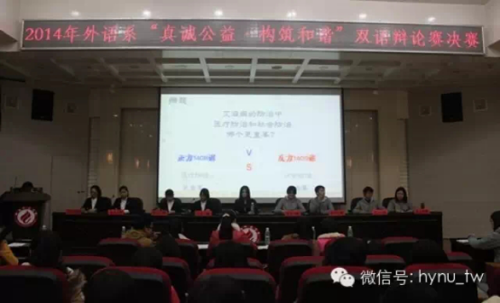 2015年1月4日晚7点,由外国语学院举办的“真诚公益,构筑和谐”双语辩论赛总决赛在外语楼北楼311教室如期举行。外国语学院党总支副书记何芳,外语系老师张敏,辅导员韩艳玲,外国语学院团总支学生分会主席谢立晶以及外国语学院辩论队队员罗鑫担任评委。