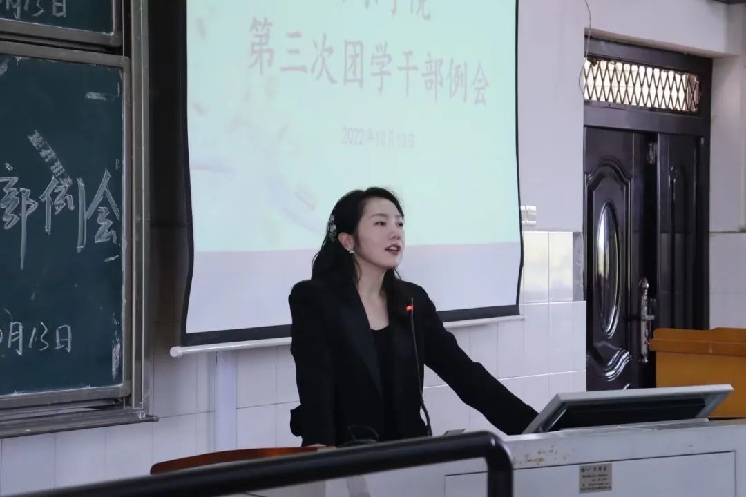 会议开始,刘老师对新干事的到来表示热烈欢迎,并向全体学生干部们提出了五项要求:一是思想政治觉悟要高。二是业务能力要强。尽快熟悉部门工作,迅速进入工作状态。三是个人作风要正。以学生干部的身份鞭策自己,发挥模范带头作用。四是综合素质全面提升。合理分配学习与工作的时间,力争做到“双优”。