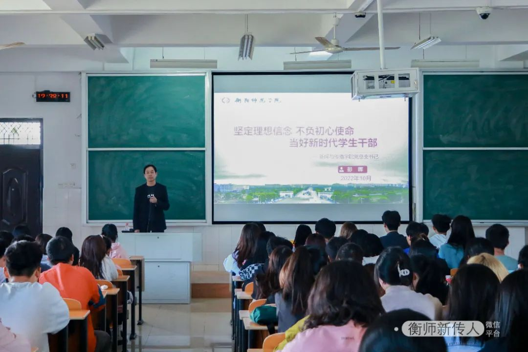 于10月11日中午,新闻与传播学院第二十一届团学干部第一次培训会议在文综楼A208举行。本次会议的主题是“坚定理想信念,不负初心使命,当好新时代学生干部”。新闻与传播学院党总支书记彭晖主持此次会议,团学分会全体成员、20-22级各班班长到现场聆听。