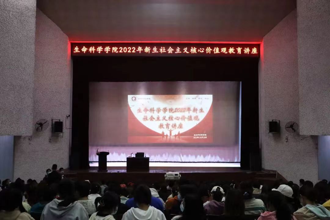 为进一步培育和践行社会主义核心价值观,增强生命科学学院学子对社会主义核心价值观的理解,树立正确的人生观、道德观、价值观,生命科学学院于2022年10月30日19:00在西校区排演厅召开了22级新生社会主义核心价值观教育讲座。生命科学学院党总支副书记陈雅斐、辅导员唐乾翔老师莅临本次讲座,党总支副书记陈雅斐担任本次讲座主讲人。