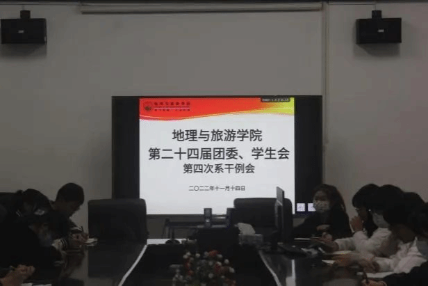 2022年11月14日下午,地理与旅游学院于理科楼北204召开了第二十四届团委、学生会第四次中层干部例会,出席本次会议的有地理与旅游学院党总支副书记文怀诚,辅导员谭盛广老师、左雯雯老师,第二十四届团委、学生会主席团和各部门中层干部。