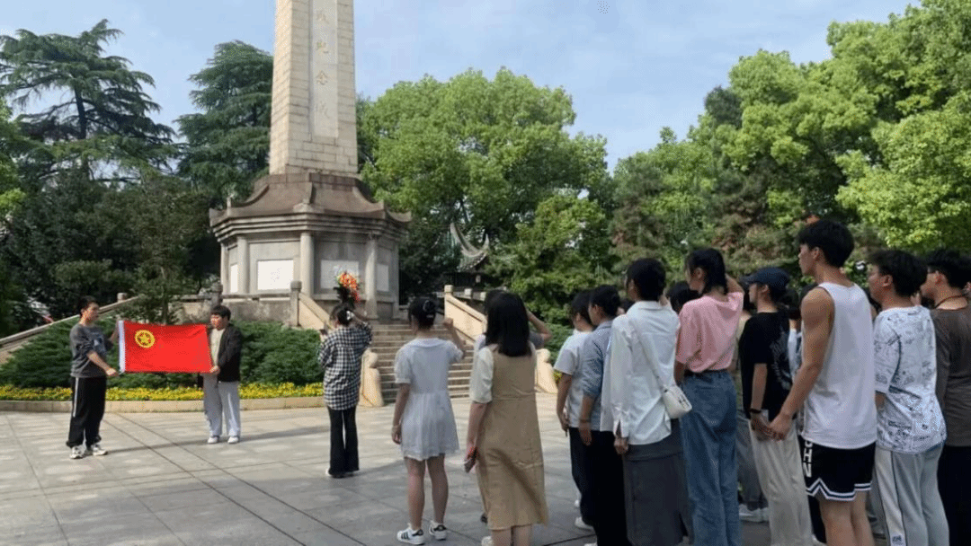 2022级法学2班团支书刘梦圆带领参加活动的同学们前往抗战纪念碑前集合,进行入团宣誓和演奏团歌。