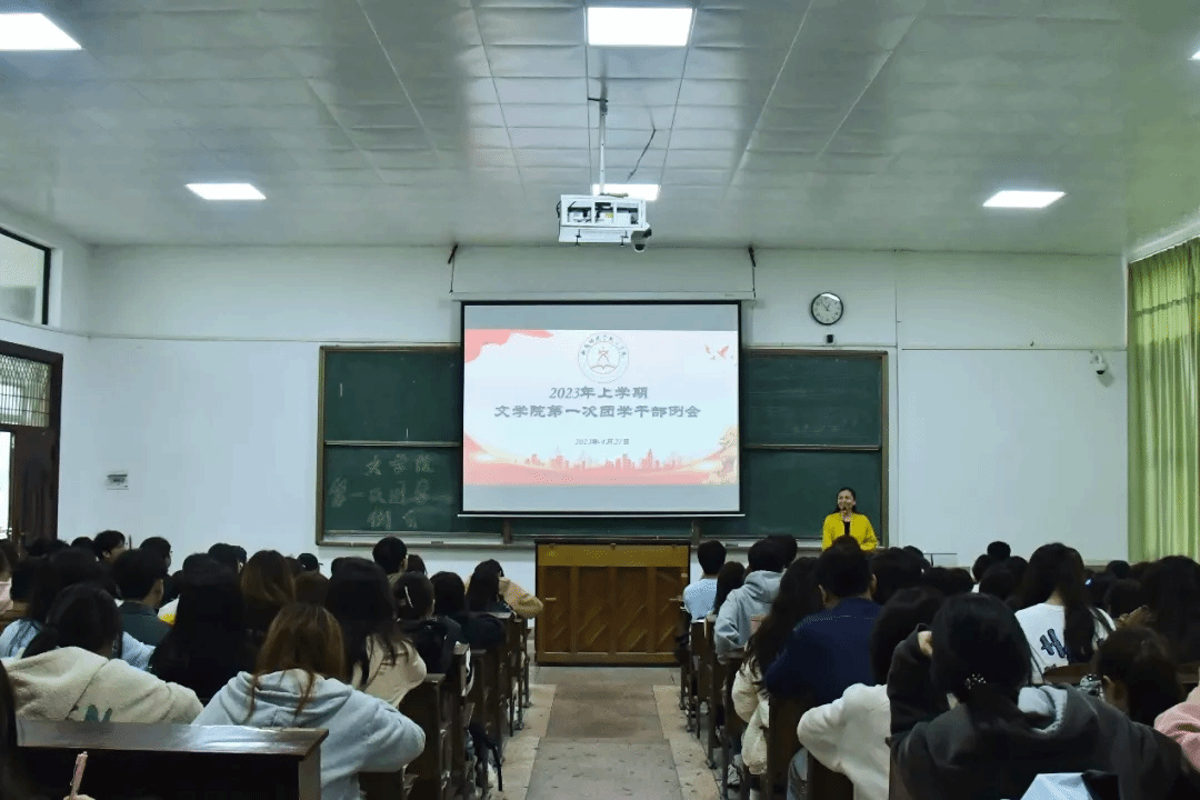 文学院于4月27日中午12:50在学奎楼104召开2023年文学院第一次团学干部例会。本次会议由文学院学工办主任谭盛广老师主持,文学院党总支副书记何颖、辅导员王天龙、刘赟老师以及各团学干部参加会议。