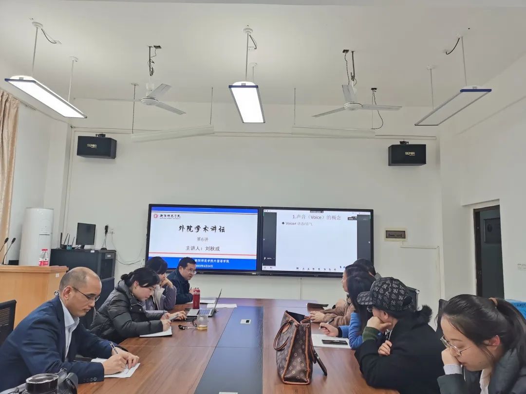 2023年4月24日下午衡阳师范学院外国语学院2023年上学期学术讲坛系列活动第6讲在外语楼南311研究生会议室举行。刘秋成老师为外国语学院教师作题为《二语学术写作中的声音构建研究:回顾和展望》的学术报告。讲座由邬德平博士主持,院长刘剑、副院长何文娟以及英语系、翻译系和商务英语系的部分教师参加了本次讲座。