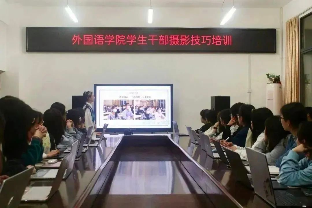 2023年4月11日晚,外国语学院召开了学生干部摄影技巧培训。本次培训由新闻与传播学院陈嘉怡、徐瑞聪主讲,辅导员陈琴主持,40余名学生干部参加培训。